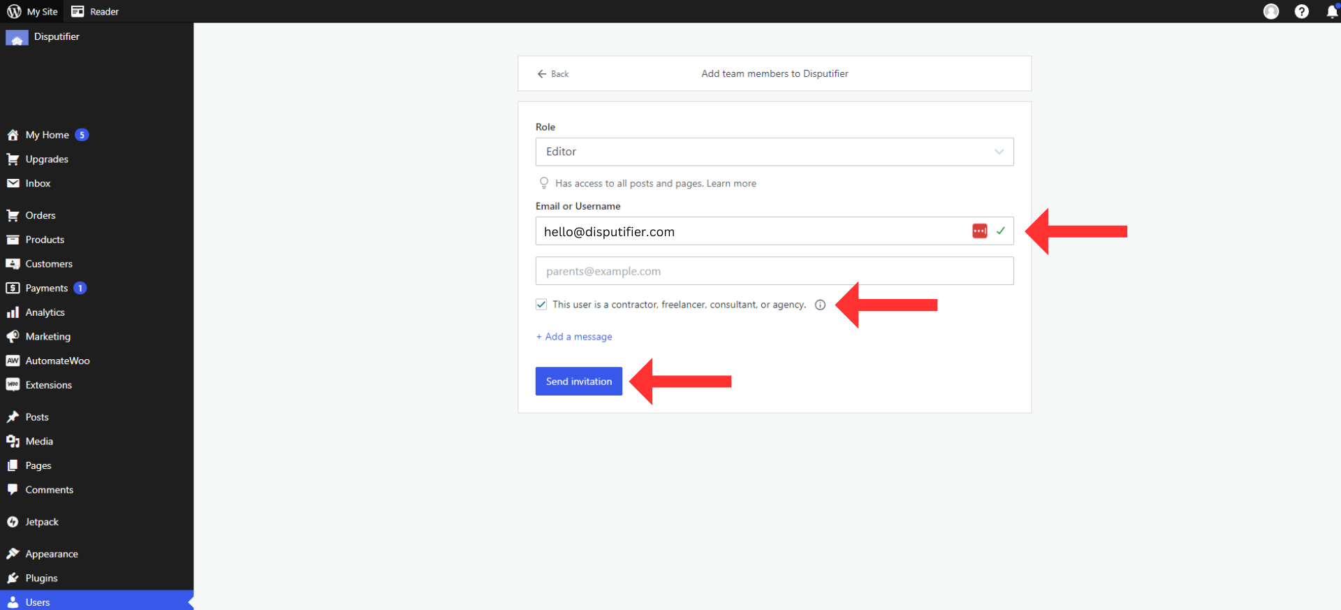 Step 4: Input hello@disputifier.com, check the "contractor, freelancer, consultant..." box