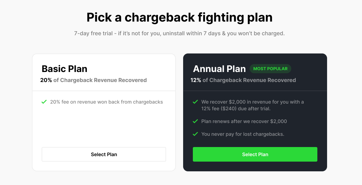 After installing, we estimate your stores annual chargeback volume based on available data sources. Then, we allow you to buy a credit for recovering this amount in chargebacks. This credit comes with a hefty 40% discount but is paid upfront after the free trial.
